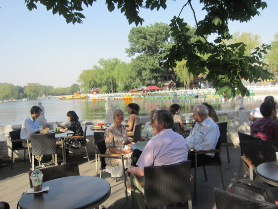 In der Gegend um den Houhai-See gibt es noch viele alte Hutongs und Wohnhöfe,. Erst in den letzten Jahren ist außerdem ein Kneipenviertel mit vielen Cafes und Restaurants am Houhai-See entstanden Bei dem schönen Wetter ist es sehr erholsam in einem Restaurant am See zu sitzen.