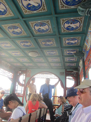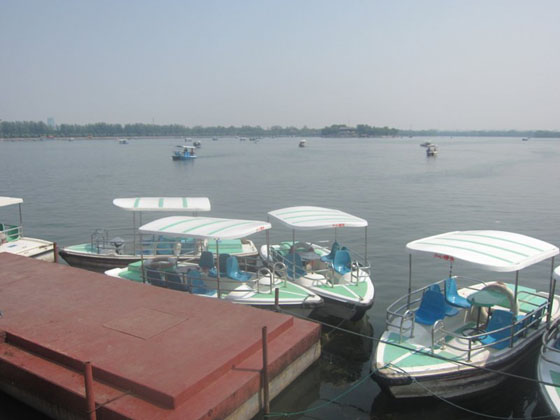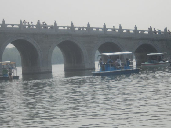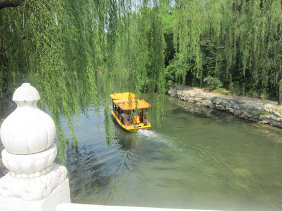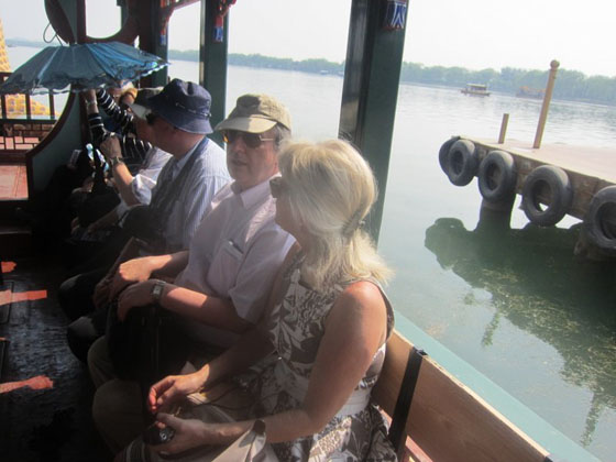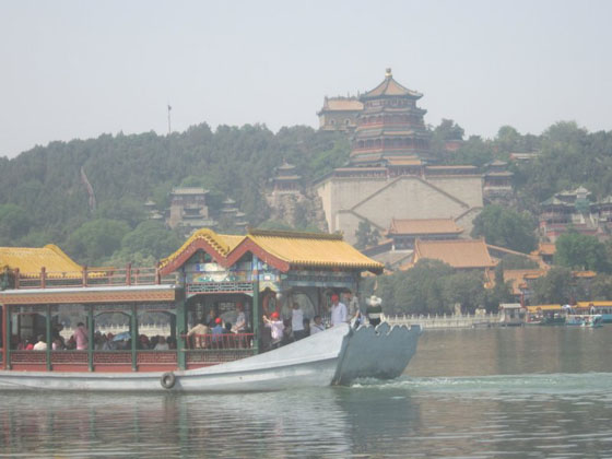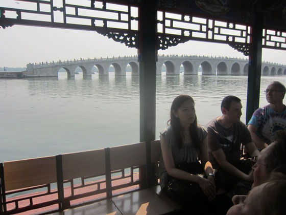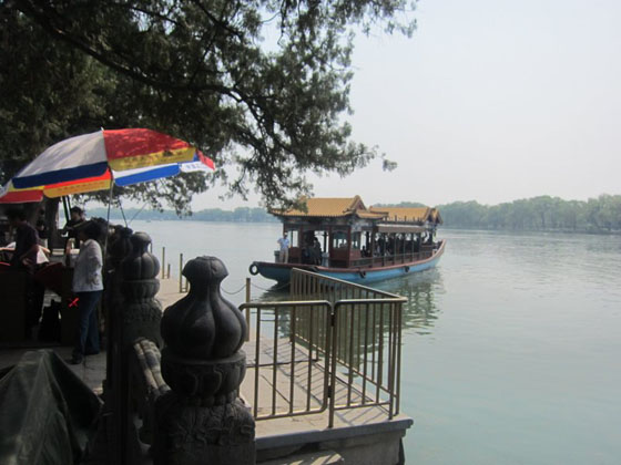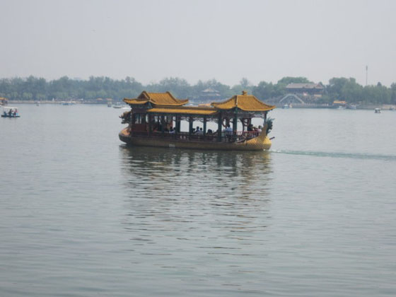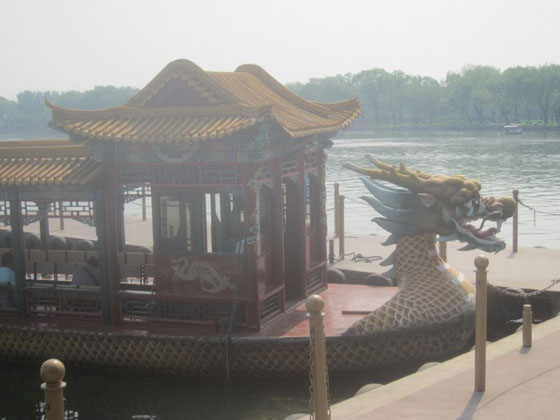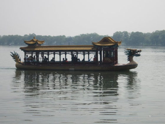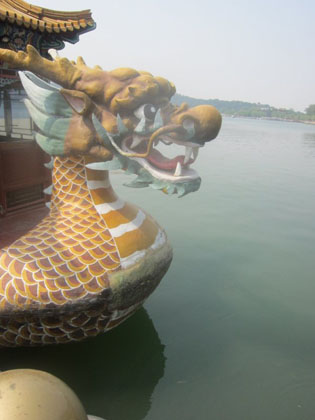 Im Wandelgang am Ufer des Kunming-Sees erkundete einen kleinen Teil des Parks und machten nach Betrachtung der steinernen Attrappe eines Raddampfers mit einem Ausflugsboot -natürlich mit Drachensymbolen-Kopf und Schwanz eine Rundfahrt auf dem See.
