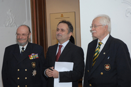 Nach den beiden Vorträgen erfolgten nun die Ehrungen durch den ÖMV. Die Laudatio hielt der Präsident des ÖMV Prof. DI Karl Skrivanek. Der erste zu Ehrende war GenLt Mag. Erich Cvitkovits , der das Goldene Marinekreuz Viribus Unitis mit Stern für seine Verdienste erhielt. Weitere Geehrte aus dem Kreis der Kameraden des ÖMV waren Ing. Herbert Reitter und Dr. Herwig Brun ( Silberne Marinekreuz Viribus Unitis mit Stern), Dr. Klaus Weichselbaum (Marinekreuz 1.Kl. V.B.) , Senator Wolfgang Steinhardt, Christof Ptak, Josef Gebel und Frau Dr. Martina Mitter (Goldene Marinekreuz V.B.).