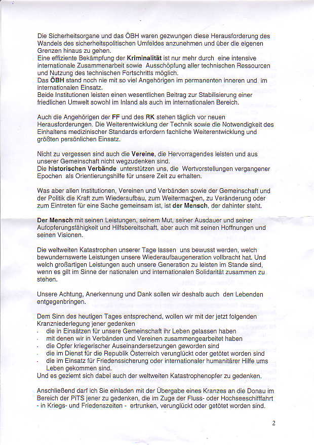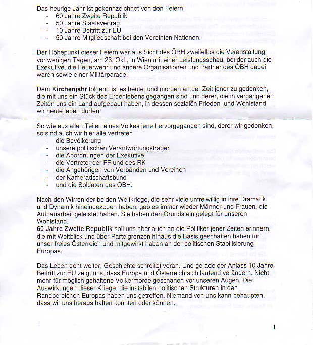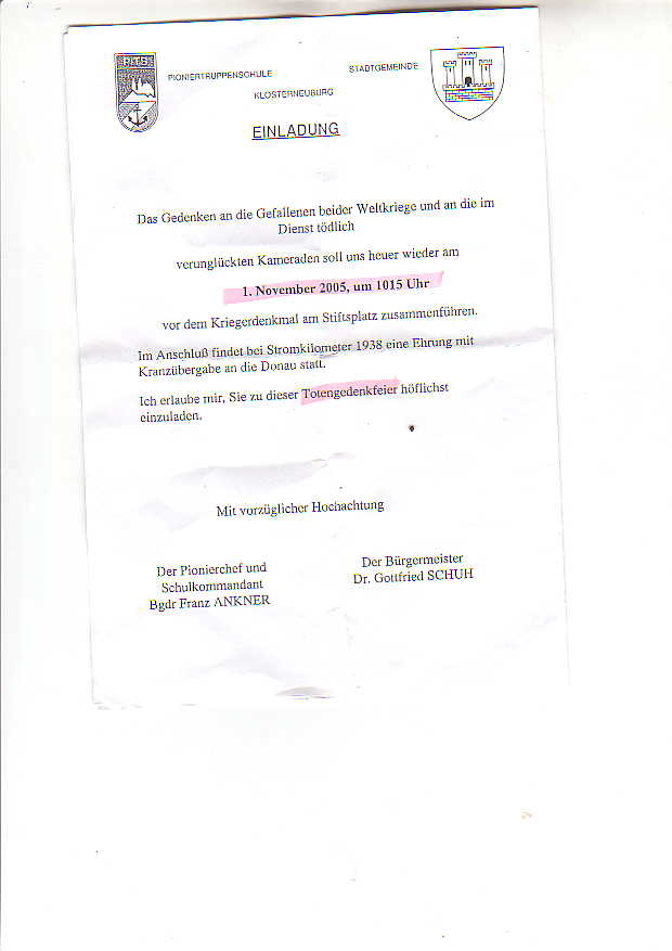 Rede des Pionierchef und Kdt der Pioniertruppenschule anlässlich der Totengedenkfeier an der Pioniertruppenschule, 1. November 2005, zum Gedenken an die Gefallenen beider Weltkriege und an die im Dienst tödlich verunglückten Kameraden vor dem Kriegerdenkmal am Stiftsplatz in Klosterneuburg. Im Anschluss fand bei Stromkilometer 1938 eine Ehrung mit Kranzübergabe an die Donau statt. Der ÖMV war bei dieser Gedenkfeier durch eine Abordnung, geführt von Präsident Oberst DI Karl Skrivanek vertreten.