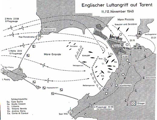 Am 11. November 2010 jährt sich zum 70en Male das Datum des britischen Angriffs mit Trägerflugzeugen auf die auf der Reede von Tarent liegenden Schlachtschiffe der italienischen Flotte. Dabei wurden 50% der verfügbaren Schlachtschiffe erheblich bis schwerstens beschädigt und wenn auch dieser Angriff zwar nicht einen grundsätzlichen Umschwung in der Seekriegführung im gesamten Mittelmeer zugunsten der Royal Navy mit sich brachte, so hatte er doch schwerwiegende Rückwirkungen auf die Operationen der italienischen Flotte und deren Einsatzbereitschaft in den folgenden für die Gesamtkriegführung kritischen Monaten. Noch heute stellt sich die Frage wie es zu einem derartigen Erfolg der britischen Torpedoflugzeuge kommen konnte und welche Umstände diesen begünstigt hatten. Man kann heute an Hand der Quellenlage feststellen, dass es sich dabei keineswegs um eine kurzfristig angesetzte Aktion gehandelt hat, die eine unvorbereitete italienische Flotte in ihrem Hauptstützpunkt überraschend getroffen hat. Vielmehr war diese Aktion von langer Hand vorbereitet und die italienische Marine waren die Möglichkeiten der britischen Trägerflugzeuge sehr wohl bekannt. Dennoch gelang der Royal Navy die taktische Überraschung und da das „Glück bekanntlich dem Tüchtigen hold ist“ erleichterten einige von der italienischen Führung inkaufgenommene Schwachstellen im Abwehrsystem von Tarent und Schutzsystem für die Schlachtschiffe zum Zeitpunkt den Angriff.