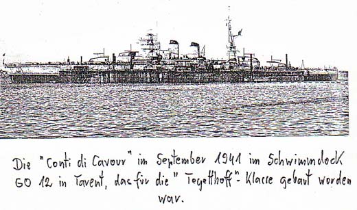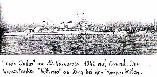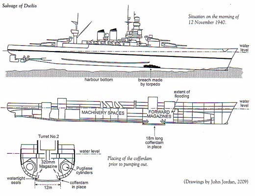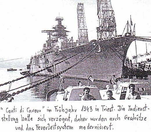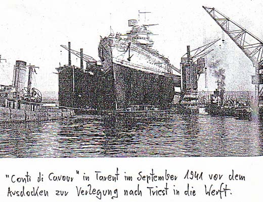 Die „Caio Duilio“ trat am 16.Juni 1941 wieder zur Flotte in Tarent, auch „Littorio“ die in Tarent ins Dock gebracht worden war, kam zu diesem Zeitpunkt wieder voll operationell zur Flotte. Die „Conti die Cavour“ hingegen war erst am 09.Juni 1941 gehoben und kam dann am 12.Juli 1941 in Tarent in das ehemals k.u.k. Schwimmdock GO 12, das ursprünglich für die Aufnahme der „Tegetthoff“-Klasse gebaut worden war. Ende 1941 lief „Conti di Cavour“ dann für die weiteren Reparaturen nach Triest, wurde jedoch nicht mehr fertig oder in Dienst gestellt. Nach dem 10.September 1943 verblieb das Schiff als Hulk in Triest, erlitt am 15. (nach anderen Quellen am 17.) Februar 1945 bei einem Luftangriff der U.S. Air Force auf Triest schwere Schäden und sank als deren Folge am 22..Februar 1945.