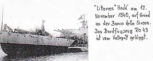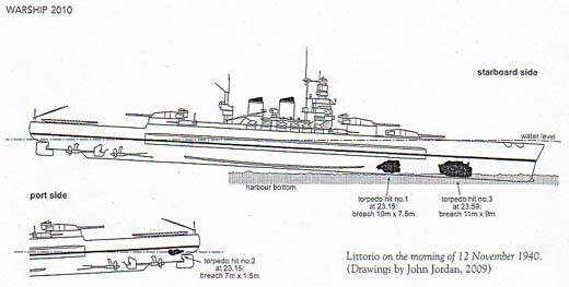 Die nächsten drei „Swordfish“ griffen mehr aus nördlicher Richtung an und davon erhielt um 2315 Uhr das moderne Schlachtschiff „Littorio“ backbord einen Torpedotreffer am Heck nahe dem Ruder, der den Schiffskörper auf 7 mal 1,5 Meter aufriß, sowie an Steuerbord einen zweiten Treffer auf Höhe des Turmes A im Vorschiff, der ein Leck von 10 mal 7 Meter zur Folge hatte. Der Torpedo der dritten „Swordfish“ verfehlte die „Vittorio Veneto“. Um 2321 Uhr war dieser Angriff bereits zu Ende. Wenige Minuten danach erhielt der diensthabende Leutnant im Oberkommando erste Meldungen über eine gewaltige Seeschlacht, worauf er die verantwortlichen hohen Offiziere alarmierte.