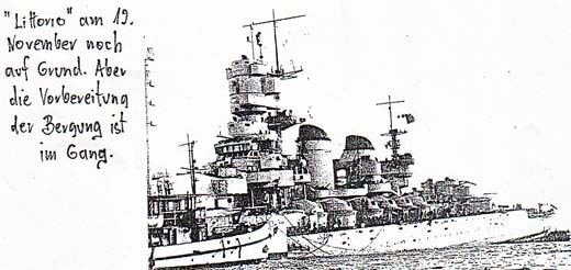 Der Kommandant der „Conti di Cavour“ beurteilte die Schäden seines Schiffes als gravierend, forderte Schlepperhilfe an und beabsichtigte das Schiff an der nahen 12 Meterlinie auf den sandigen Grund zu setzen. Um 2345 Uhr waren die Schlepper „Tenace“ und „Boeo“ bereit das Schlachtschiff abzuschleppen, das die Anker eingeholt hatte und nur mehr an der Boje hing. Zu diesem Zeitpunkt hatte sich der Tiefgang der „Conti di Cavour“ bereits um 0,6 Meter erhöht. Auf der „Littorio“ versuchte man mit den eigenen Pumpen den Wassereinbruch zu beherrschen.