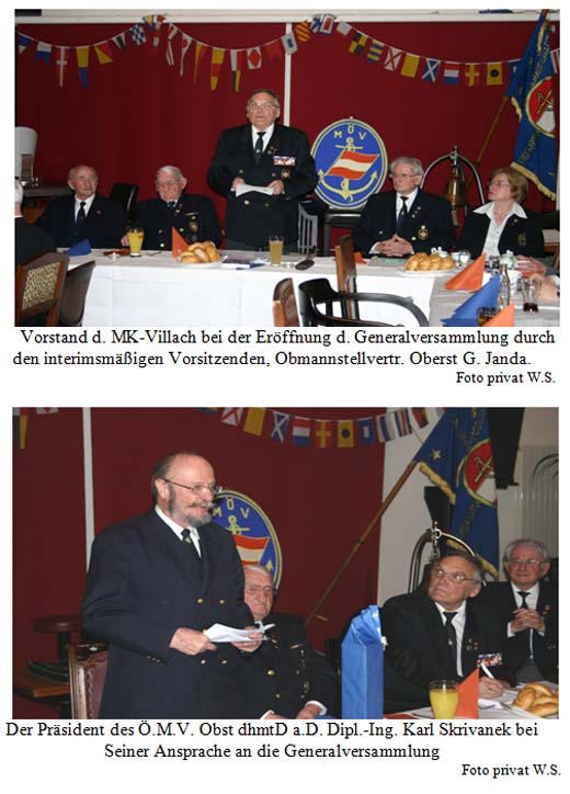 Eine besondere Aufwertung erfuhr diese Veranstaltung durch die Anwesenheit des Präsidenten des Österreichischen Marineverbandes, Herrn Baurat h. c. Oberst dhmtD a. D. DI Karl Skrivanek, der eigens aus Wien angereist war. Vorgestaffelt zu dieser Generalversammlung konnte der Präsident bereits von einer Abordnung im neuen Vereinslokal der MK – Villach empfangen werden. Unter der Führung des Obmannes Leo Terpetschnig und des Obmstv. Kurt Schlossstein konnte sich DI Skrivanek einen eindrucksvollen Überblick über die Entstehung dieser neuen „Kajüte“ machen. Der Präsident zeigte sich über die liebevolle Gestaltung, Einrichtung und Lage des neuen Vereinslokales der Villacher Marinekameraden ausgesprochen angetan.