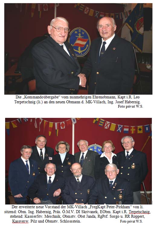 Der DDSG-Kapt. i.R. Leo Terpetschnig, seit dem 07.03.2002 Obmann der Marinekameradschaft in Villach, musste aus gesundheitlichen Gründen im Februar dieses Jahres bedauerlicher Weise seine Führungsfunktion zurücklegen. Leo Terpetschnig erlebte bereits den WK II in der deutschen Kriegsmarine. Die Schifffahrt hielt unseren bisherigen Obmann allerdings weiter im Banne, wo er viele Jahre, im Rahmen der DDSG, die Donau bis in das Schwarze Meer befahren hatte. Zuletzt, bis zum Übertritt in den verdienten Ruhstand, versah er seinen Dienst als Kapitän auf dem Passagierschiff „Schönbrunn“.