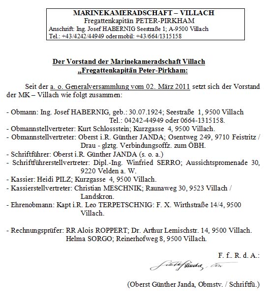 Durch seine Entscheidung, die Obmannstelle der MK-Villach zur Verfügung zu stellen, wurde am 02. 03. 2011 in der Lounge des Park-Cafe, im ehemaligen Parkhotel / Villach, - dem nunmehrigen „Heimathafen“ der Kameradschaft unter der Leitung vom Obmannstellvertreter, Oberst i.R. Günther Janda, eine a. o. Generalversammlung abgehalten. Eine besondere Ehre für die Versammlung stellte die Anwesenheit des Präsidenten des Ö.M.V., Herrn Obst dhmtD a.D. Prof. Dipl.-Ing. Karl Skrivanek, dar. Nach den üblichen vereinstechn. Berichten gemäß der Tagesordnung, folgte mit der Kooptierung eines neuen Obmannes das Hauptthema, der einstimmige Wahlausgang für den bisher als Rechnungsprüfer im Verein tätigen, Ing. Josef Habernig zum nunmehrigen Obmann der MK-Villach. Ein weiterer Wahlgang mit demselben einstimmigen Ergebnis bestätigte dem Vereinsmitglied, Frau Helma Sorgo, künftig als Rechnungsprüferin mitzuwirken. Der große Applaus der Versammlungsteilnehmer, der den neu gewählten Funktionären galt, bestätigte die Richtigkeit dieser Auswahl. (Anmerkung: alle übrigen Vereinsfunktionäre wurden ja anlässlich der letzten ordentl. Generalversammlung gewählt und müssen sich erst 2012 der (Wieder-)Wahl stellen!) Als Nächstes wurde über den Antrag des Vorstandes abgestimmt, den, in seiner bisherigen Obmannfunktion so verdienstvoll wirkenden, Leo Terpetschnig zum Ehrenobmann der MK-Villach zu ernennen. Der logisch folgende, umfassende Beifall konnte diese Ernennung vollends bestätigen!