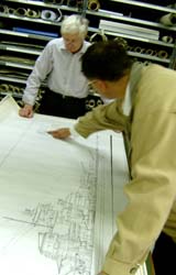 In der Werft wurden wir von Herrn Grotz empfangen und durch das Hauptarchiv geführt, wo man uns sämtliche vorhandene Pläne der BISMARCK zeigte und erklärte. Wir hatten Gelegenheit, die Pläne in vielen Details zu studieren.