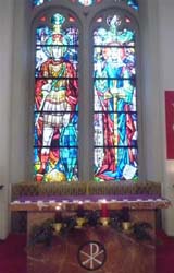 1958 stiftete die Burgenländische Landesregierung das große Doppelmittelfenster, welches den Heiligen Martin als römischen Offizier und die Heilige Barbara als Patronin der Artillerie darstellt. Die beiden Seitenfenster symbolisieren Brot und Wein, die damaligen Hauptprodukte des Burgenlandes und Zeichen der Eucharistie. Ebenso befindet sich im Altarbereich eine Sandsteinmadonna - eine verkleinerte Kopie der Dienstbotenmadonna aus dem Wiener Stephansdom. Der Altar wurde aus Untersberger Marmor ausgeführt. Das Tabernakel, das Altarkreuz und die Festtagskerzenleuchter sind ein Geschenk des Österreichischen Militärbischofs S.E. Mag Christian Werner aus der St.Georgs-Kathedrale in Wiener Neustadt. Die vier Bilder an den Seitenwänden sind im Stil der Nazarener gemalt und