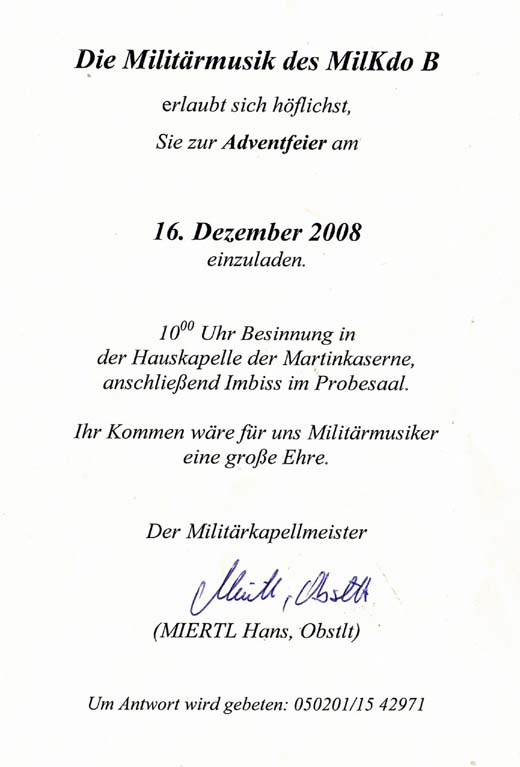 Am 16.12.2008 lud die Militärmusik des Militärkommandos Burgenland Kameraden und Freunde zur Adventfeier in die Hauskapelle der Martinkaserne in Eisenstadt ein. Kapellmeister Obstlt Hans Miertl konnte neben den Repräsentanten des Mikdo, geführt von Militärkommandant Bgdr Mag. Johann LUIF, auch viele Ehrengäste, Ehrenmitglieder der MilMusik Burgenland, etc. - die auch weite Anfahrtswege auf sich genommen hatten - begrüßen.